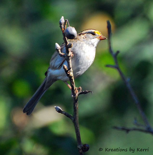 As I was watching/photographing this White-throated sparrow thru the dining room window, the sun came out and shined on his sweet face. If you look closely you can see some left-over berry juice on his beak.
