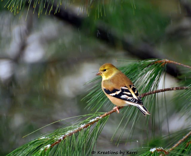 The birds were out in full force yesterday during our first snowfall. This goldfinch sheltered in the pine trees while waiting for a turn at the feeders.