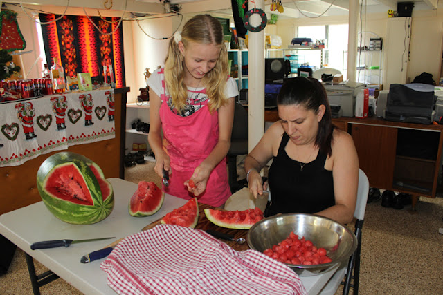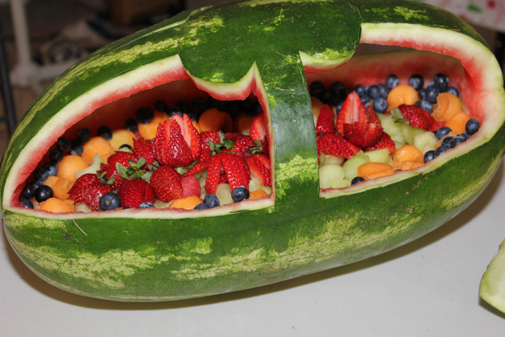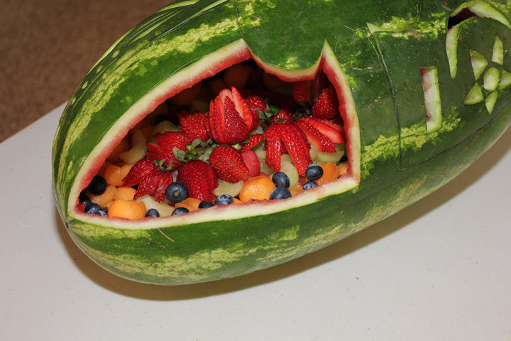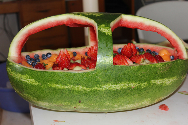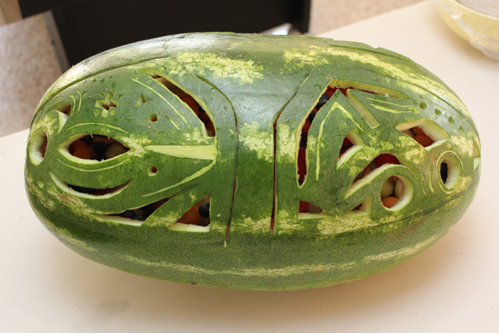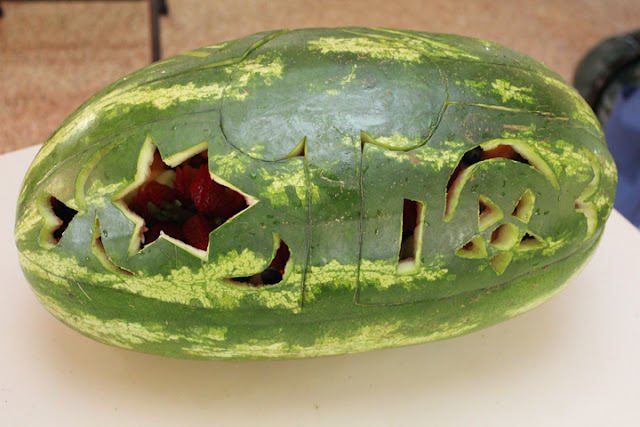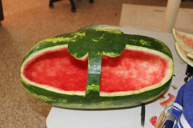I was inspired to carve a watermelon for the New Year celebrations when a friend gave me a home grown monster. I thought I was being pretty original until we went to get a couple of melon ballers the day before New Years eve. One shop had two left! So much for originality. I then thought the melons shape would be pretty easy to carve. Mind you, the last watermelon I carved was for the engagement party of my first marriage, ummmm....31 years ago. So much for thinking!