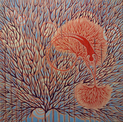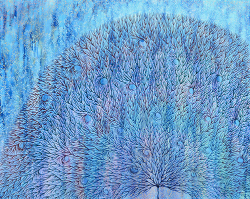 This poem at one level is about dying. My mother, very bravely recited it my grandmother's funeral in 1991. Yet, as the years go by, and the more I think about the things I think about, I see that it is also about life...or how life could be...with imagination. As I read this poem I sense that the women I paint, as they float across the ripples created by my much loved trees-of-life, are upon 'the open horizon' swept by 'fresher winds' as they shed 'the brighter light' at the same time as they are drawn to it. The women in my paintings represent eternal Mother, Mother Nature, and my grandmother's line 'each star a stepping stone' creates visions of life traversed across the Universe...and indeed possibly the Multiverse.